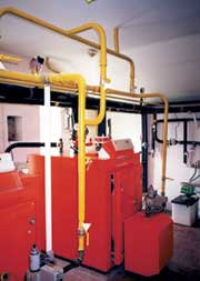 Водогрійні газові котли Paromat-Simplex потужністю по 130 кВт кожний з параметрами теплоносія 95-70 °С та максимальною температурою 110 °С працюють за каскадною схемою з автоматикою управління Dekamatik M1, M2. Завдяки конструкції котла (триходовий котел з великим внутрішнім об’ємом теплоносія та великими відстанями між стінками) відбувається надійна передача теплоти й хороша внутрішня циркуляція води. Завдяки низькому навантаженню в камері згоряння забезпечується оптимізація режиму спалювання з викидами в атмосферу невеликої кількості шкідливих речовин, а також додаткове зниження температури вихідних газів та зменшення викидів чадного газу за рахунок триходової системи котла. Оптимальний режим спалювання та низький вміст шкідливих речовин забезпечується також за рахунок застосування двоступінчастих пальників, налагоджених на заводі-виробнику на потужність котла й перевірених у роботі за допомогою комп’ютерної програми.