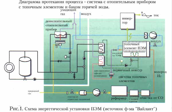 В принципе можно считать, что низкие рабочие температуры предъявляют низкие требования к материалам относительно выносливости и, напротив, высокие требования к газоподготовке, и дают более низкий КПД. Абсолютно противоположная ситуация у топливных элементов с высокими рабочими температурами. Разработки по применению PAFC и MCFC в мини-ТЭЦ в настоящее время приостановлены. Эти типы обусловливают при холодном пуске переход электролита из твердой в жидкую фазу. Так как в самом малом классе мощностей требуется частое повторение процесса пуска, это приводит к тому, что фаворитами становятся топливные элементы типа РЕМ (ПЭМ) и SOFC с твердым электролитом. Топливные элементы с полимерно-электролитической мембраной (РЕМ - ПЗМ)Электролит ПЭМ состоит из тончайшей полимерной пленки. Реакция в элементе эpтого типа протекает при температуре на уровне 80°С, в силу чего возможности использования уходящего тепла ограничены. К качеству топливного газа и его подготовке предъявляются высокие требования. Положительными качествами ПЭМ являются невысокие термические требования к материалу, высокая мощностная плотность и способность к быстрому и холодному пуску. Недостатком является то, что большая мощностная плотность обусловливает работу батареи элементов с высоким давлением. Это создает необходимость в дополнительных механических компонентах, затратах на регулирование и шумовой эмиссии. Для ПЭМ требуется устройство предварительной газоподготовки, включающее в себя удаление серы и Shift-конвертор для оксидации вредного для стопки топливных элементов СО, так что загрязнение горючего газа должно быть сокращено до минимума. На рис. 1 показана схема полной силовой установки с топливными элементами в том виде, в каком она разработана фирмой "Вайлант" для параллельной работы с сетью. Система в целом дополняется горелкой дожига (форсажной камерой), теплоносителем (теплопередачей) для отбора полезного тепла и инвертором (преобразователем постоянного тока в переменный).