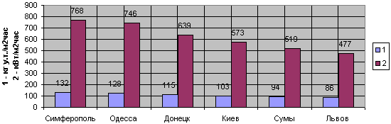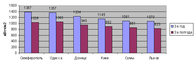 Рис. 2. Энергия солнечной радиации, достигающая поверхности земли в городах Украины. |
